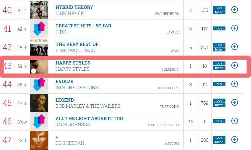 El álbum Harry Styles se encuentra en el puesto 43 del Top 100 ventas de álbumes de los Official Charts del Reino Unido