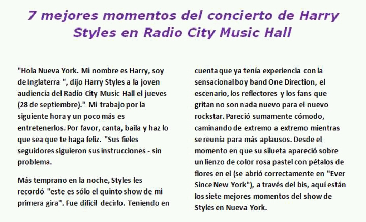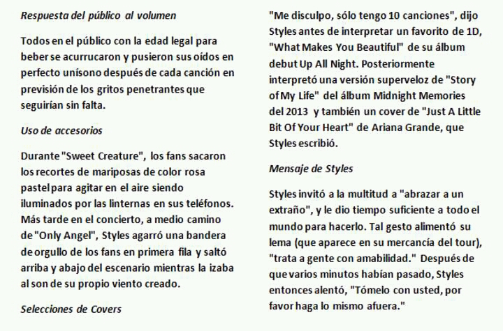 Todos esperaban el mismo procedimiento que en los anteriores conciertos, pero donde va a parar, Harry supera cada vez más las expectativas, todo empezó con su telón de estampado floral, su sombra a través de un reflector, Ever Since New York como la primera canción... y así fue, lo que no se esperaba nadie fue lo que ocurrió un rato después. Harry decidió cantar una versión de Story Of My Life, de su banda One Direction, y como no tod@s nos emocionamos, es una canción preciosa y escuchar esa versión la hace realmente especial.