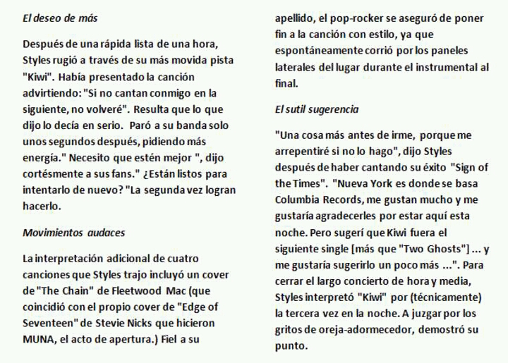 Pero esto no es todo, antes de cantar Sign Of The Times, la última canción del show, comentó que cantaría una más, pero detrás de ello se escondía una sorpresa, ¡Harry Styles volvió a cantar Kiwi! y ¿a que no saben qué? al mismo tiempo ¡Harry nos desveló que será su próximo single!, esto si es una buena manera de acabar el concierto no creen?, no podemos esperar para escucharlo y que nos muestre un videoclip, esperamos que no sea colgando de un helicóptero.