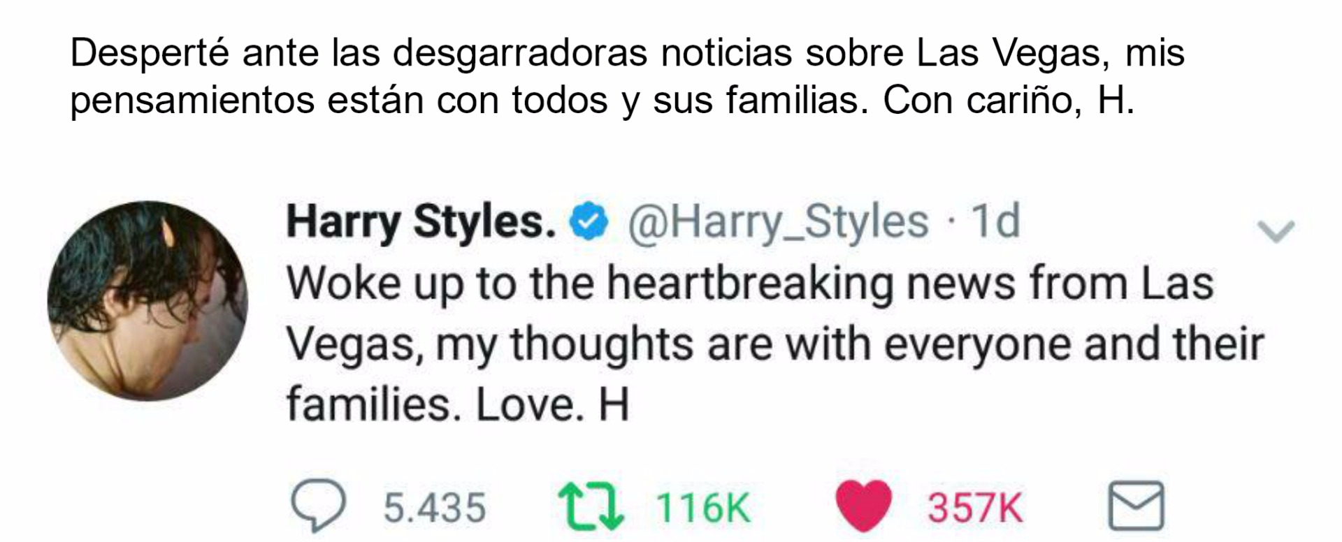 El domingo 1/10 por la noche, ocurrió un tiroteo en un concierto celebrado a las afueras de un casino en Las Vegas, Estados Unidos, y Harry se pronunció condenando los hechos y dando apoyo a las víctimas y sus familiares, como otras numerosas personas han hecho, a través de Twitter.